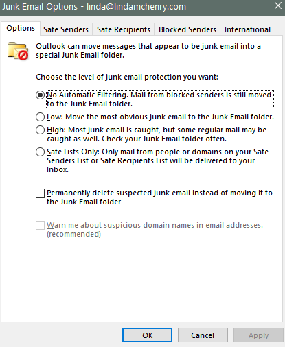 Junk email settings are a lot easier to control when your email address is proprietary rather than free. For example, my email address is associated with my website domain, so I have complete control over it. If you use Gmail, Yahoo, AOL, or any other free email software, you may not have as much freedom to control the settings.