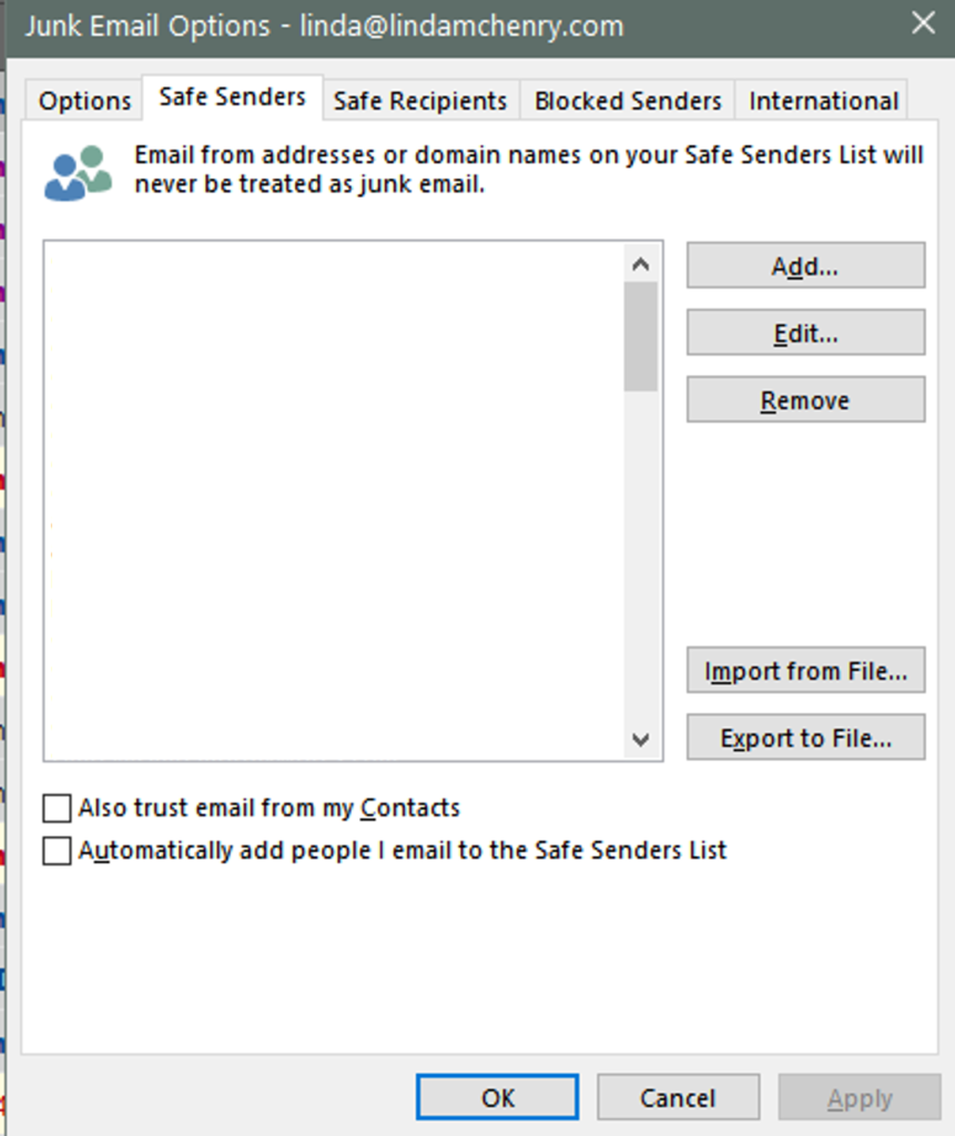- The image on the right shows how you can ADD someone into a Safe Sender’s list, meaning the messages from that individual email address or domain will NOT be sent to your Junk folder